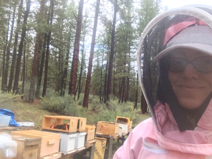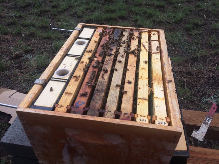 This is a five-frame “nucleus” hive – Ruby picked up five of these small hives from a local apiary that specializes in “survivor bees” that are locally adapted to Southern Oregon.