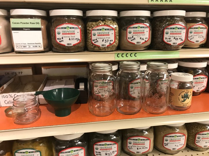 We store empty produce bags in the bucket. We also keep a couple of extra empty jars in case we decide to pick up something we hadn’t planned to buy at the co-op. When it’s time to shop, we can just grab the bucket and go.